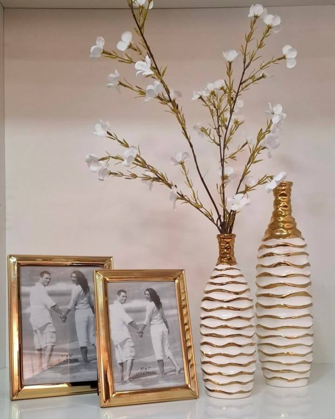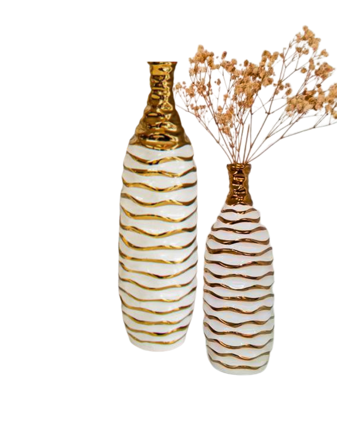 Diseñado con una textura ondulada, aporta movimiento y brillo. Su acabado metálico en la parte superior le da un toque de lujo, convirtiéndolo en una pieza perfecta para destacar en salas, comedores, recibidores o mesas auxiliares.