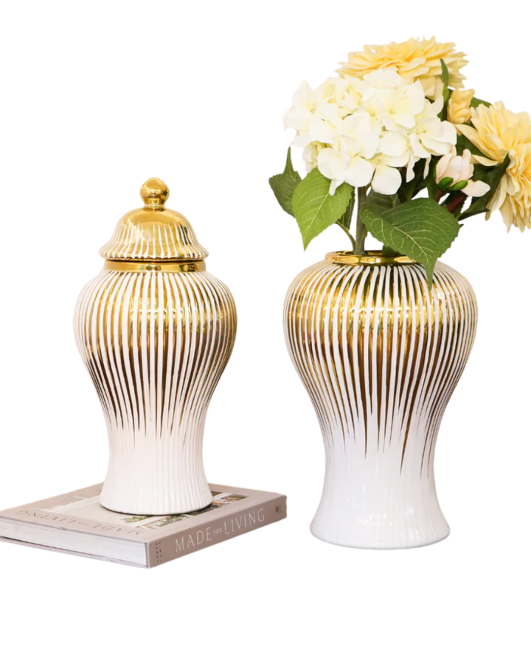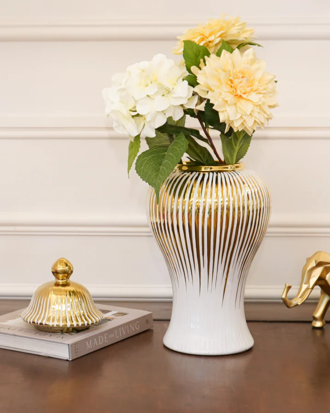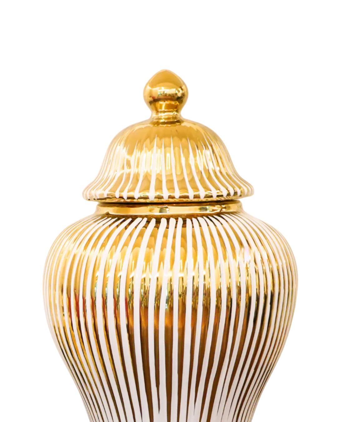 Añade un toque de lujo a tu decoración con este jarrón decorativo con tapa en tonos dorado y blanco. Su diseño curvo y sus líneas metálicas realzan la luz y aportan un estilo sofisticado y atemporal a cualquier ambiente.